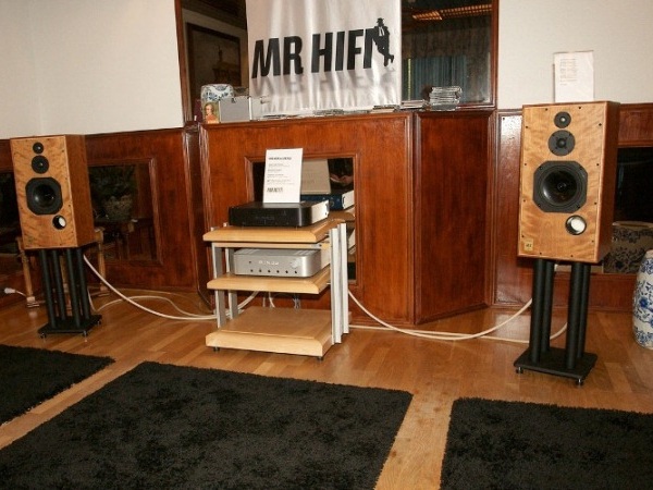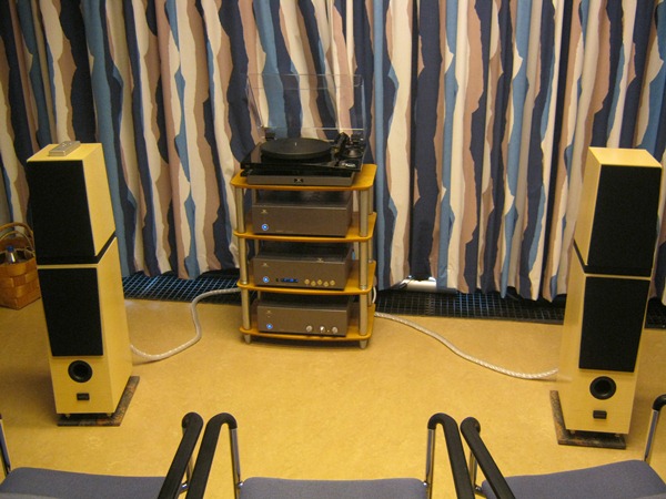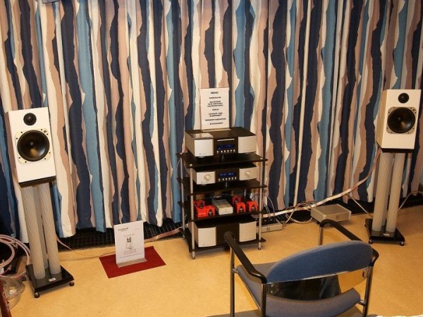 Hifihuone oli onnistunut virittelemään menestyksellisesti Totem Fire-jalustakaiuttimet ja Lindemannin elektroniikan hyvin pieneen ja ongelmalliseen tilaan. Lopputulos oli kuitenkin hyvä ja varsin tasapainoinen. Bassopää oli jopa puhtaampi kuin joillakin messujen raskassarjalaisilla. Tällaiseen ympäristöönhän ei pidä yrittääkään rakentaa liian mahtipontista äänimaailmaa, vaan tehdä laitevalinnat myös kuuntelutila huomioiden. Tässä Hifihuoneen pojat olivat onnistuneet mielestäni hyvin. Huoneessa tulikin kuunneltua testilevyjäkin ihan mielellään.