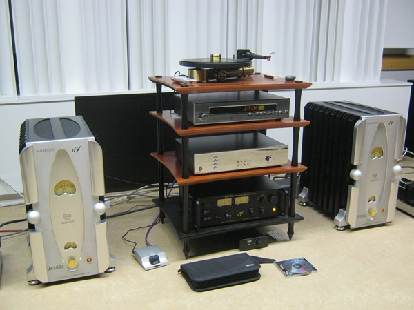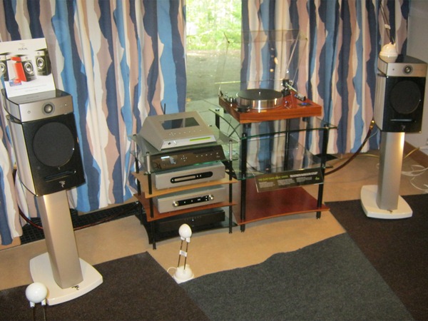 Myös AH oli onnistunut virittämään laitteistonsa, Focalin Diablo Utopiat ja Primaren elektroniikan, hienosti pieneen huoneeseen. Aiemmin olin kuullut näitä kaiuttimia varsin suuressa tilassa, jossa ne esiintyivät myös edukseen. Ilmeisestikin Diablo Utopiat saadaan huolellisella sijoittelulla soimaan hyvin varsin monenlaisissa huoneissa. Toisto oli nimittäin varsin puhdasta, selkeää ja dynaamiset kontrastitkin mainiosti välittävää. Bassopää oli pienten kaiuttimien seteistä miehekkäin. Lisäksi kattaus tarjosi messujen ehkä kaikkein luontevinta symbaalien soundia!