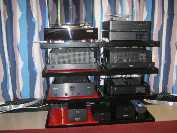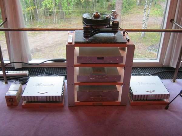 Pekka ja kumppanit olivat ottaneet johtotähdeksi esitellä kuulijoille laitteiston tarjoamaa suorituskykyä suuremmillakin äänenpaineilla. Todettua tuli, ettei äänellinen paketti hajonnut, vaikka kuunteluvoimakkuudet hipoivat monien kuulijoiden sietorajoja. Pääsimme toki kuuntelemaan normivolyymilläkin, etenkin omia testilevyjä, joiden perusteella paljastui mm., että etenkin toistoalueen ääripäät olisivat kaivanneet hiukan tiukempaa ja puhtaampaa otetta. Puutteellisella akustiikalla oli tähän tietenkin oma vaikutuksensa. Esitys oli kuitenkin kokonaisuudessaan mielestämme messujen parhaimmistoa ja toimi etenkin Brinkmannin vinyylipyöritintä lähteenä käyttäen hienosti.